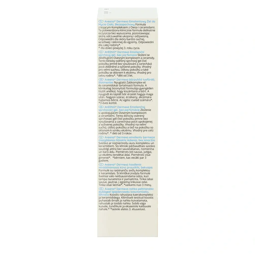 Az Aveeno® Dermexa bőrpuhító tusfürdőt nyugtató hatású zabkomplexszel és ceramidokkal fejlesztettük ki. A klinikailag tesztelt, bőrkompatibilis összetevőkből álló vegán* formula gyengéden tisztít anélkül, hogy kiszárítaná a bőrt, továbbá kellemes ápoltságérzetet kölcsönöz neki. Az Aveeno® Dermexa bőrpuhító tusfürdő nyugtatja és védi a nagyon száraz, érzékeny, viszkető bőrt. Az tusfürdő a család összes tagjának ajánlott**. A 98%-ban biológiai úton lebomló formula illatmentes. Bőrbetegségekre − például ekcémára − hajlamos pácienseknek is ajánlott.
